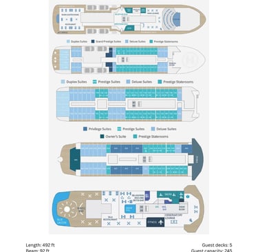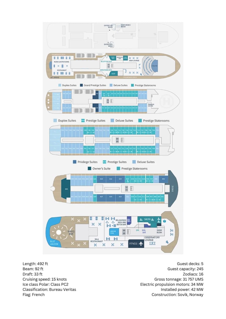 Le Commandant Charcot icebreaker has 123 cabins, all have either a balcony or private terrace.